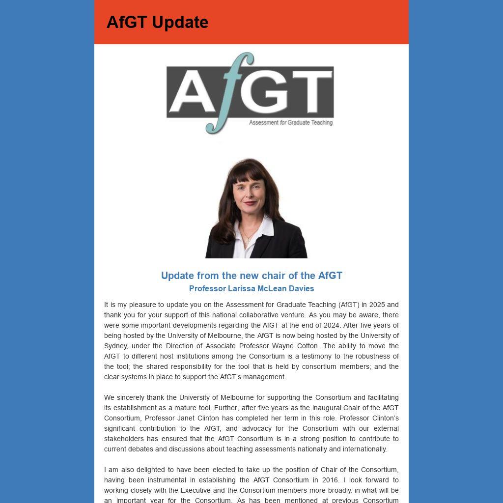 It is my pleasure to update you on the Assessment for Graduate Teaching (AfGT) in 2025 and thank you for your support of this national collaborative venture. As you may be aware, there were some important developments regarding the AfGT at the end of 2024. After five years of being hosted by the University of Melbourne, the AfGT is now being hosted by the University of Sydney, under the Direction of Associate Professor Wayne Cotton. The ability to move the AfGT to different host institutions among the Consortium is a testimony to the robustness of the tool; the shared responsibility for the tool that is held by consortium members; and the clear systems in place to support the AfGT’s management.
