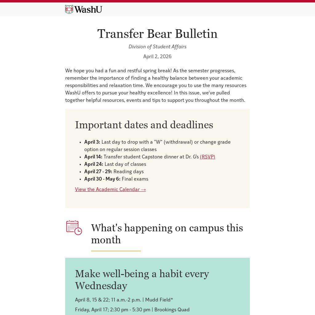 We hope you had a fun and restful spring break! As the semester progresses, remember the importance of finding a healthy balance between your academic responsibilities and relaxation time. We encourage you to use the many resources WashU offers to pursue your healthy excellence! In this issue, we’ve pulled together helpful resources, events and tips to support you throughout the month.