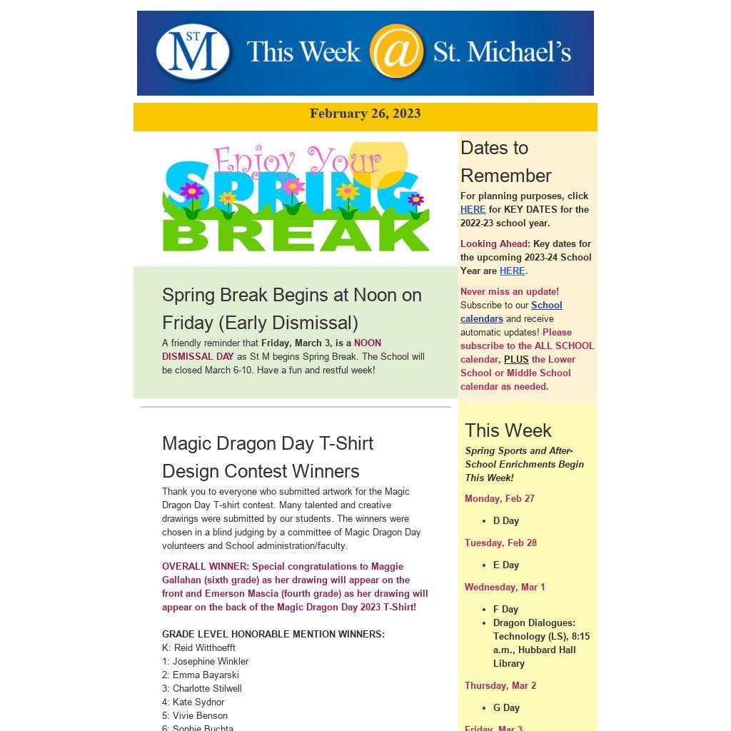 A friendly reminder that Friday, March 3, is a NOON DISMISSAL DAY as St M begins Spring Break. The School will be closed March 6-10. Have a fun and restful week!