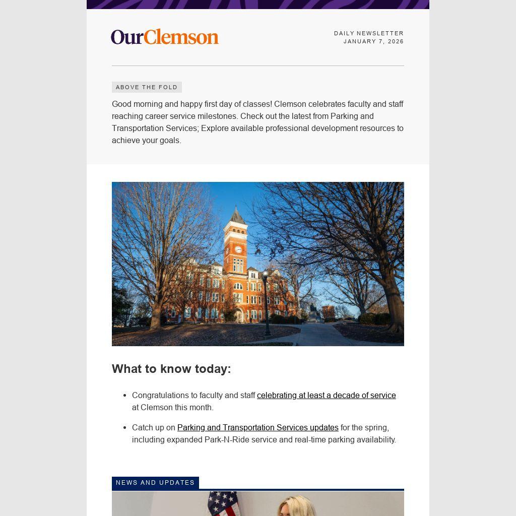 Good morning and happy first day of classes! Clemson celebrates faculty and staff reaching career service milestones. Check out the latest from Parking and Transportation Services; Explore available professional development resources to achieve your goals.