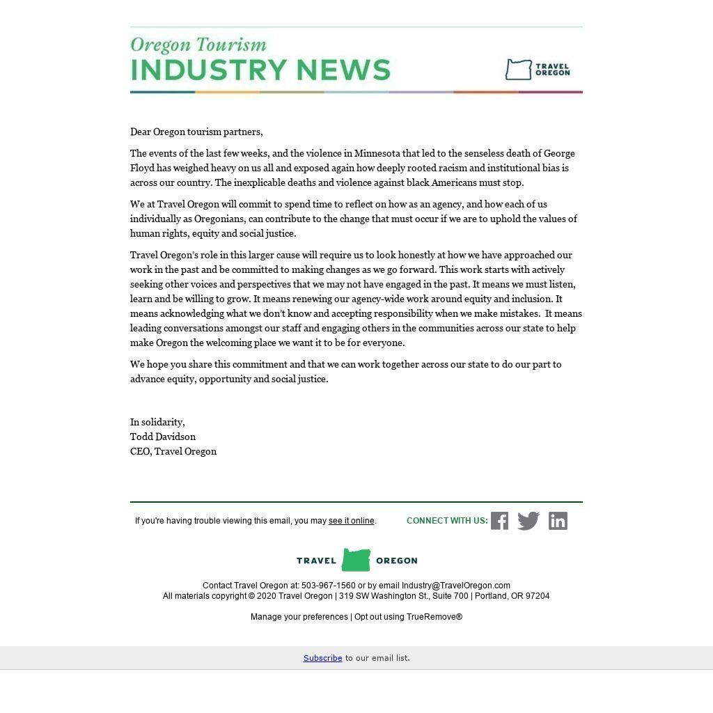 We at Travel Oregon will commit to spend time to reflect on how as an agency, and how each of us individually as Oregonians, can contribute to the change that must occur if we are to uphold the values of human rights, equity and social justice.
