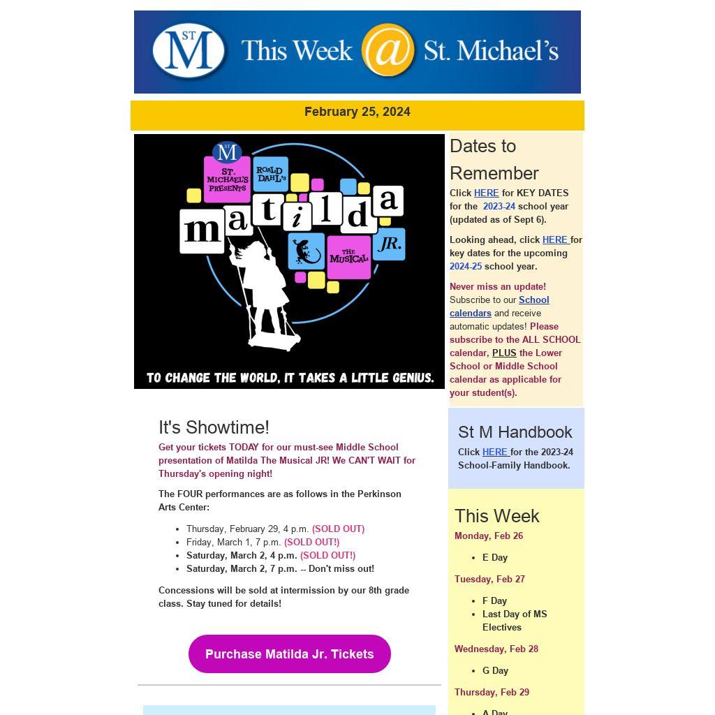 St. Michael's Extended Day is providing aftercare for parents who want to have their student(s) drop into Extended Day from 2:55-3:45 p.m. BEFORE the 4 p.m. Matilda JR. performance on February 29.