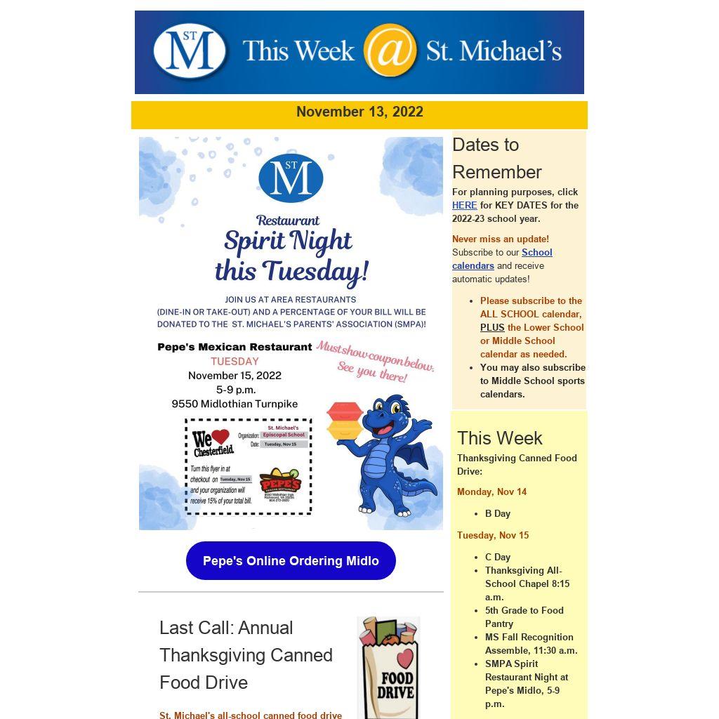St. Michael's all-school canned food drive ends on Tuesday, November 15, to benefit the St. Michael's Church Food Pantry. In these challenging economic times, the Food Pantry is serving more people than ever. Food items will be collected in homerooms and advisories.