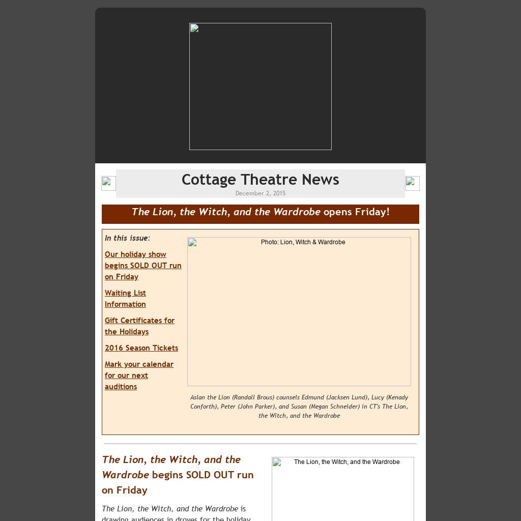 The Lion, the Witch, and the Wardrobe begins SOLD OUT run on Friday The Lion, the Witch, and the Wardrobe is drawing audiences in droves for the holiday season! Our cast and crew are putting on the finishing touches this week; they look forward to sharing this magical story with you starting Friday, December 4.