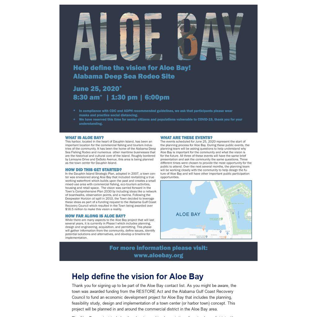 Thank you for signing up to be part of the Aloe Bay contact list. As you might be aware, the town was awarded funding from the RESTORE Act and the Alabama Gulf Coast Recovery Council to fund an economic development project for Aloe Bay that includes the planning, feasibility study, design and implementation of a town center (or harbor town) concept. This project will be planned in and around the commercial district in the Aloe Bay area.
