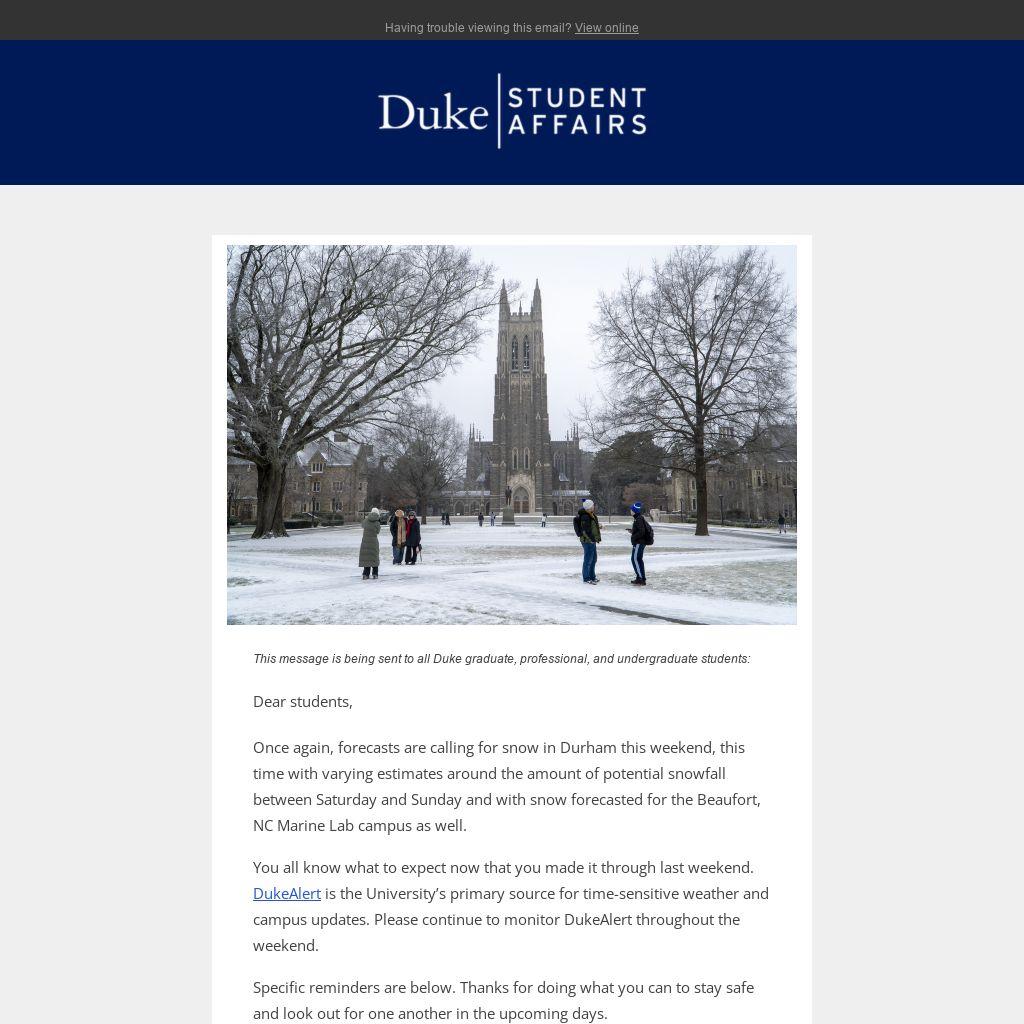 Please continue to monitor DukeAlert for the most up-to-date information throughout the storm. Be assured that many support teams will be staying on campus to ensure continuous operations and monitor conditions in the next few days.