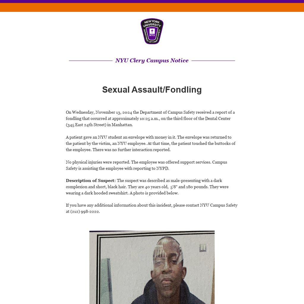On Wednesday, November 13, 2024 the Department of Campus Safety received a report of a fondling that occurred at approximately 10:25 a.m., on the third floor of the Dental Center (345 East 24th Street) in Manhattan.
