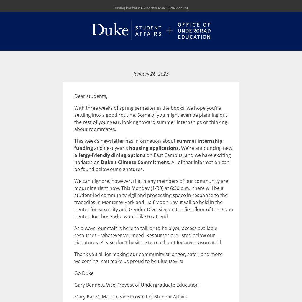 This week's newsletter has information about summer internship funding and next year's housing applications. We're announcing new allergy-friendly dining options on East Campus, and we have exciting updates on Duke's Climate Commitment. All of that information can be found below our signatures.