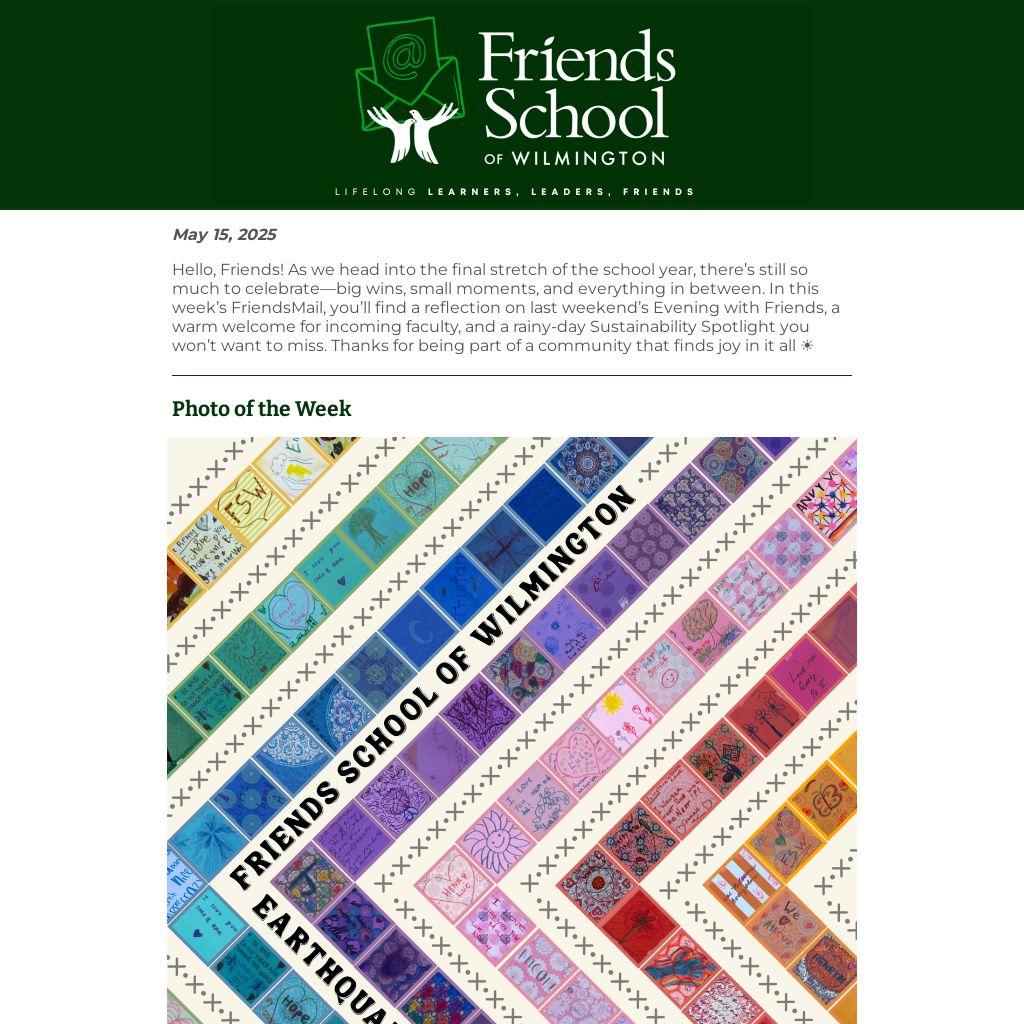 Hello, Friends! As we head into the final stretch of the school year, there’s still so much to celebrate—big wins, small moments, and everything in between. In this week’s FriendsMail, you’ll find a reflection on last weekend’s Evening with Friends, a warm welcome for incoming faculty, and a rainy-day Sustainability Spotlight you won’t want to miss. Thanks for being part of a community that finds joy in it all ☀️