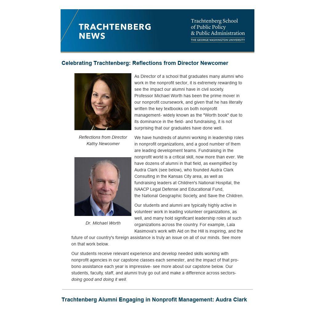 As Director of a school that graduates many alumni who work in the nonprofit sector, it is extremely rewarding to see the impact our alumni have in civil society. Professor Michael Worth has been the prime mover in our nonprofit coursework, and given that he has literally written the key textbooks on both nonprofit management- widely known as the "Worth book" due to its dominance in the field- and fundraising, it is not surprising that our graduates have done well.