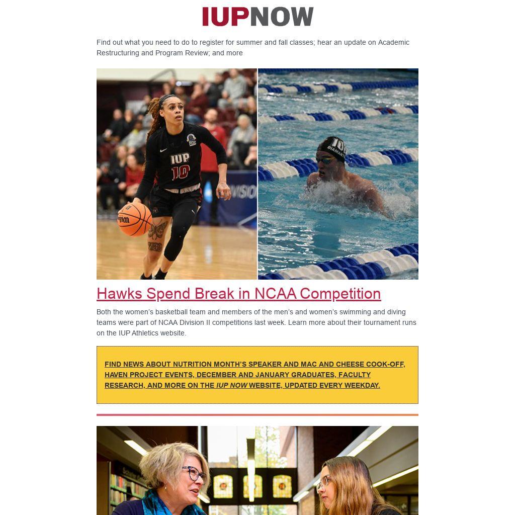 Distributed to employees and students once a week on Wednesdays, the IUP Now newsletter provides news highlights from across the university, compiled by the Office of Marketing and Communications. Find more news on the IUP Now website, updated every weekday. Find out how to get your news and events in IUP Now.