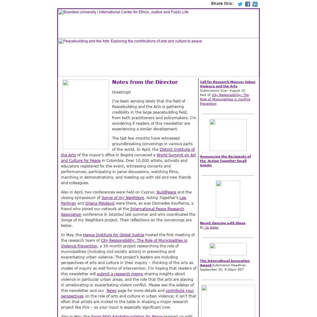 In May, the Hague Institute for Global Justice hosted the first meeting of the research team of City Responsibility: The Role of Municipalities in Violence Prevention, a 30-month project researching the role of municipalities (including civil society actors) in preventing and exacerbating urban violence. The project’s leaders are including perspectives of arts and culture in their inquiry – thinking of the arts as modes of inquiry as well forms of intervention. I’m hoping that readers of this newsletter will submit a research memo sharing insights about violence in particular urban areas, and the role that the arts are playing in ameliorating or exacerbating violent conflict. Please see the sidebar of this newsletter and our News page for more details and contribute your perspectives on the role of arts and culture in urban violence; it isn’t that often that artists are invited to the table in shaping a major research project like this – so your input is especially significant now.
