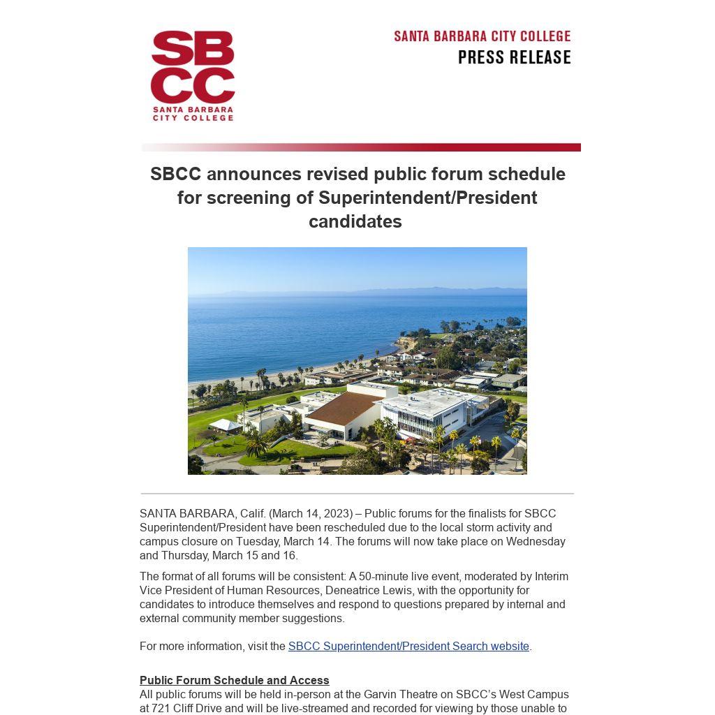 SANTA BARBARA, Calif. (March 14, 2023) – Public forums for the finalists for SBCC Superintendent/President have been rescheduled due to the local storm activity and campus closure on Tuesday, March 14. The forums will now take place on Wednesday and Thursday, March 15 and 16.