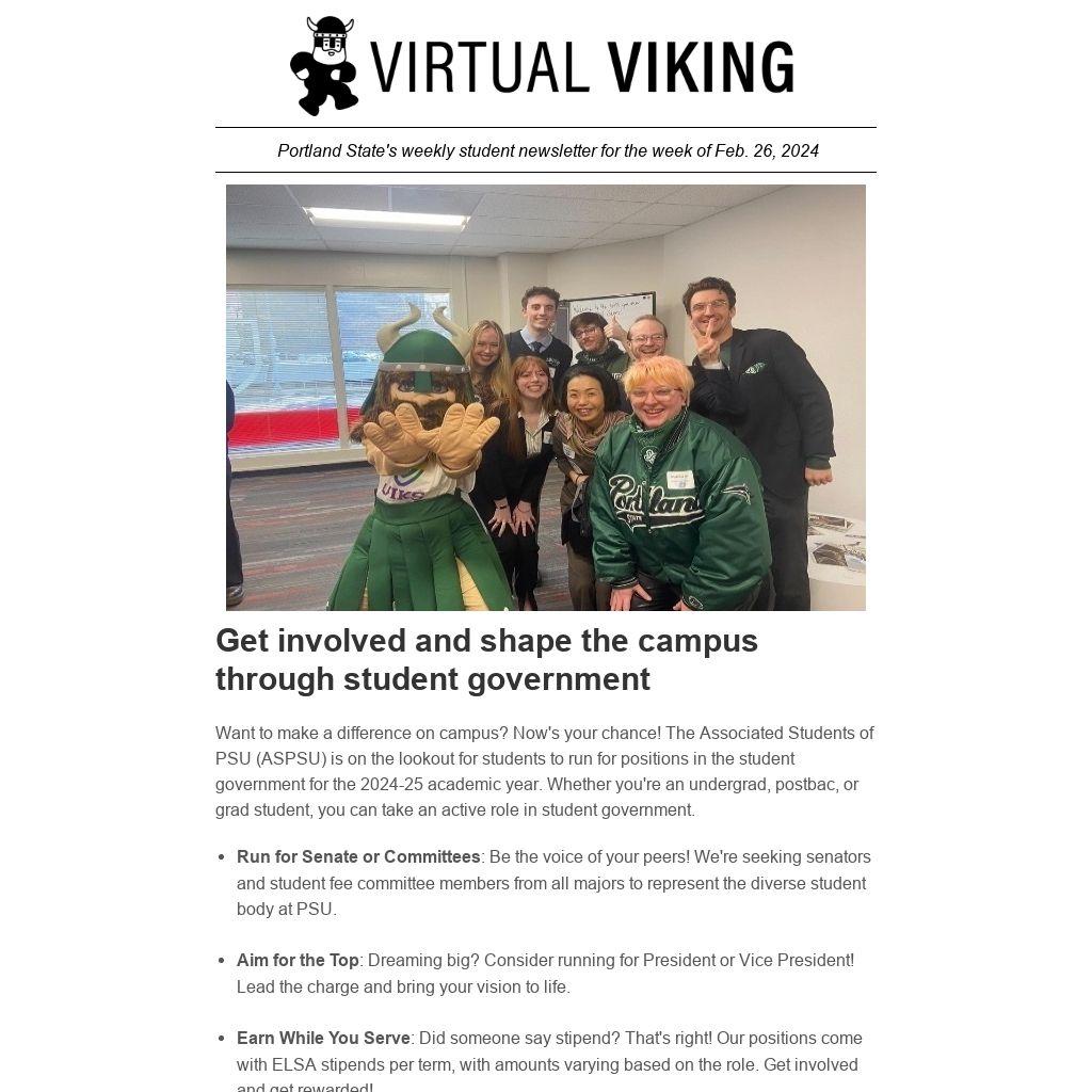 Virtual Viking is Portland State University's weekly student newsletter, published on Mondays by University Communications. To submit news or events, email virtualv@pdx.edu or visit pdx.edu/virtual-viking.