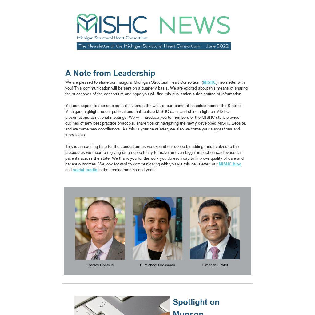 We are pleased to share our inaugural Michigan Structural Heart Consortium (MISHC) newsletter with you! This communication will be sent on a quarterly basis. We are excited about this means of sharing the successes of the consortium and hope you will find this publication a rich source of information.