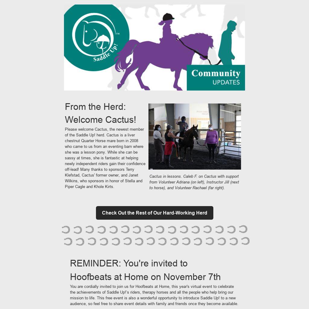 Please welcome Cactus, the newest member of the Saddle Up! herd. Cactus is a liver chestnut Quarter Horse mare born in 2008 who came to us from an eventing barn where she was a lesson pony. While she can be sassy at times, she is fantastic at helping newly independent riders gain their confidence off-lead! Many thanks to sponsors Terry Klefstad, Cactus' former owner, and Janet Wilkins, who sponsors in honor of Stella and Piper Cagle and Khole Kirts.