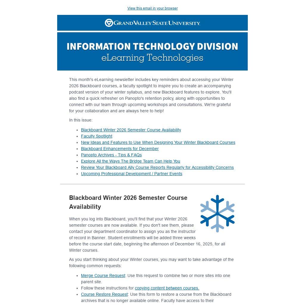 This month's eLearning newsletter includes key reminders about accessing your Winter 2026 Blackboard courses, a faculty spotlight to inspire you to create an accompanying podcast version of your winter syllabus, and new Blackboard features to explore. You'll also find a quick refresher on Panopto's retention policy, along with opportunities to connect with our team through upcoming workshops and consultations. We're grateful for your collaboration and are always here to help!