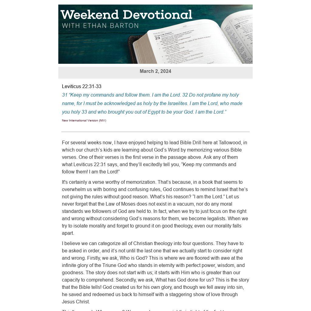 For several weeks now, I have enjoyed helping to lead Bible Drill here at Tallowood, in which our church’s kids are learning about God’s Word by memorizing various Bible verses. One of their verses is the first verse in the passage above. Ask any of them what Leviticus 22:31 says, and they’ll excitedly tell you, “Keep my commands and follow them! I am the Lord!”