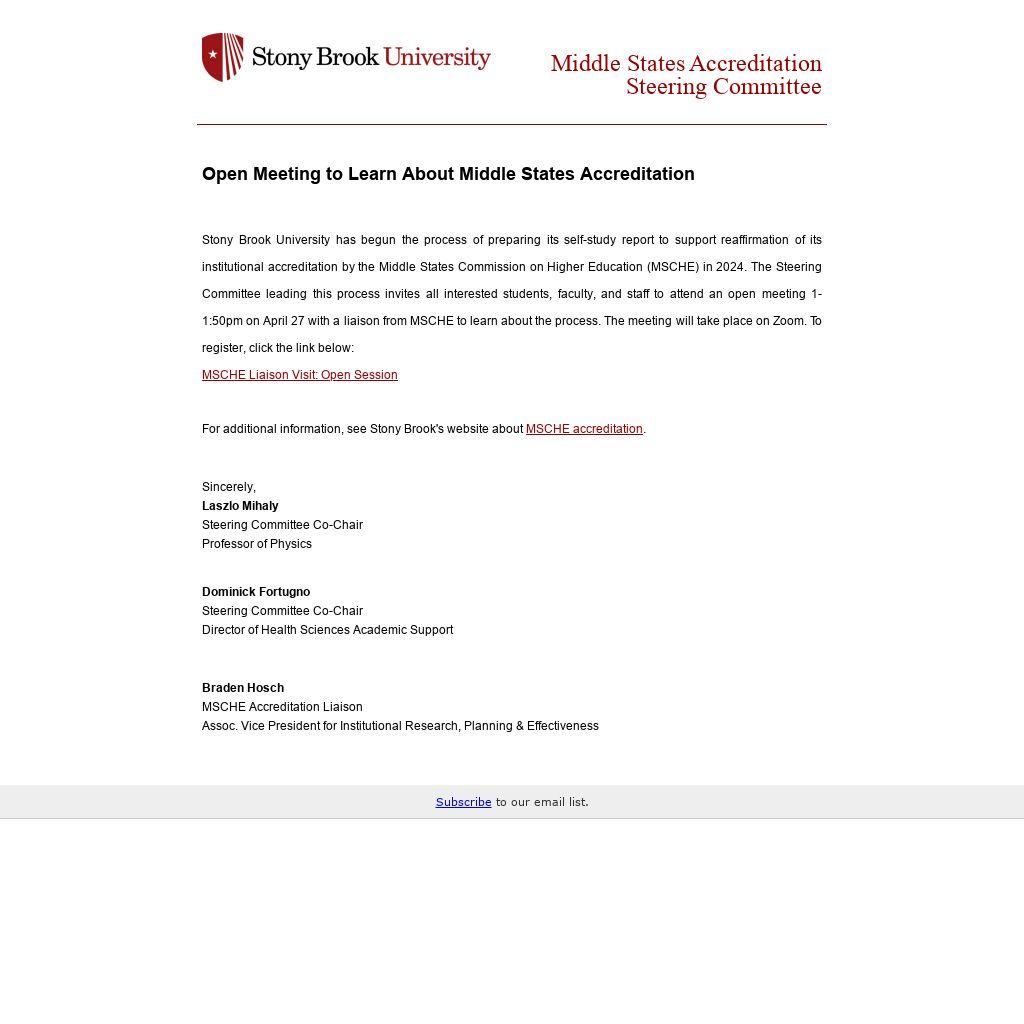 Stony Brook University has begun the process of preparing its self-study report to support reaffirmation of its institutional accreditation by the Middle States Commission on Higher Education (MSCHE) in 2024. The Steering Committee leading this process invites all interested students, faculty, and staff to attend an open meeting 1-1:50pm on April 27 with a liaison from MSCHE to learn about the process. The meeting will take place on Zoom. To register, click the link below: