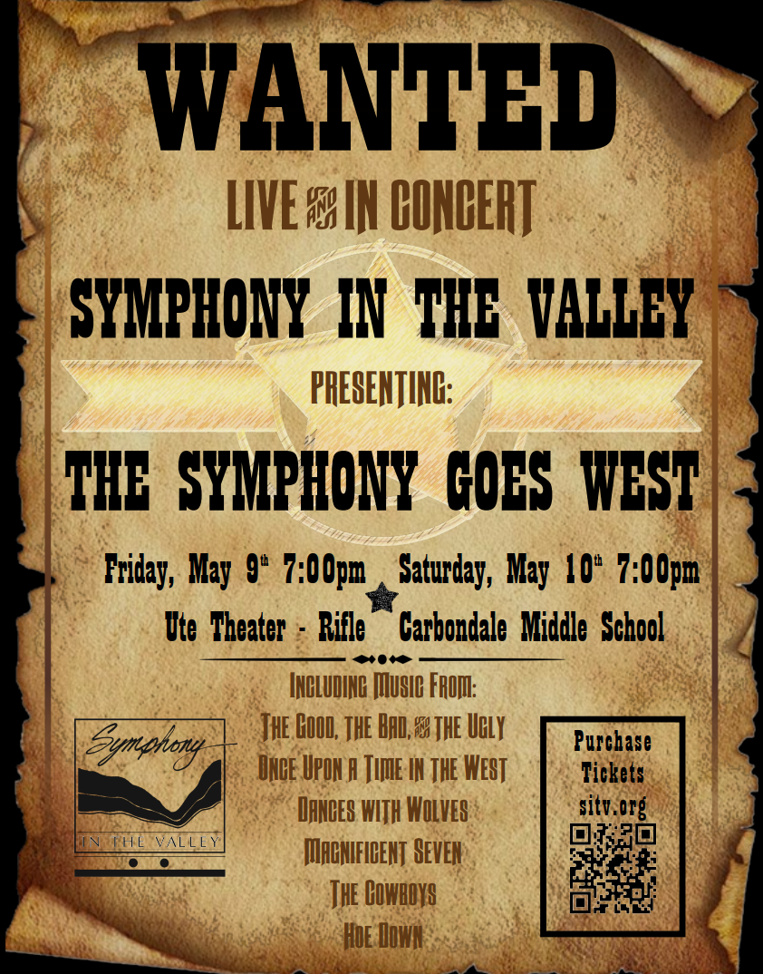 Wanted - Live and in Concert, Symphony in the Valley presenting The Symphony Goes West on Friday, May 9 at Ute Theater, Rifle at 7 p.m. and Saturday, May 10 at Carbondale Middle School at 7 p.m. Click here to buy tickets.