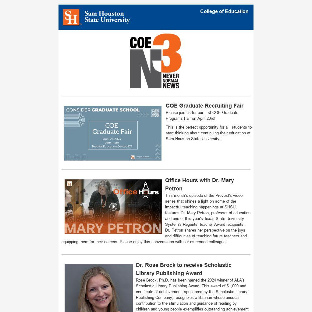 This month’s episode of the Provost's video series that shines a light on some of the impactful teaching happenings at SHSU, features Dr. Mary Petron, professor of education and one of this year's Texas State University System's Regents' Teacher Award recipients. Dr. Petron shares her perspective on the joys and difficulties of teaching future teachers and equipping them for their careers. Please enjoy this conversation with our esteemed colleague.