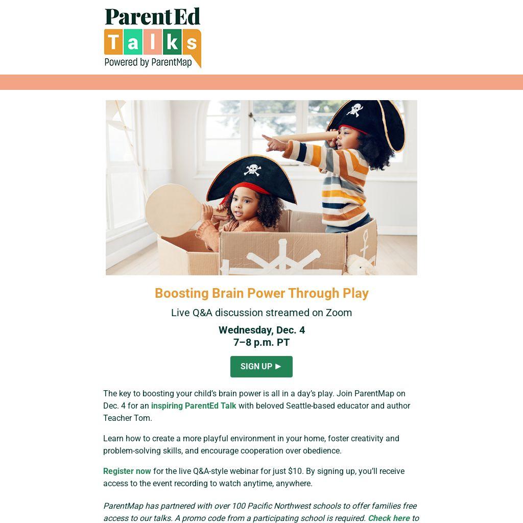 ParentMap has partnered with over 100 Pacific Northwest schools to offer families free access to our talks. A promo code from a participating school is required. Check here to see if your school or district is a member.