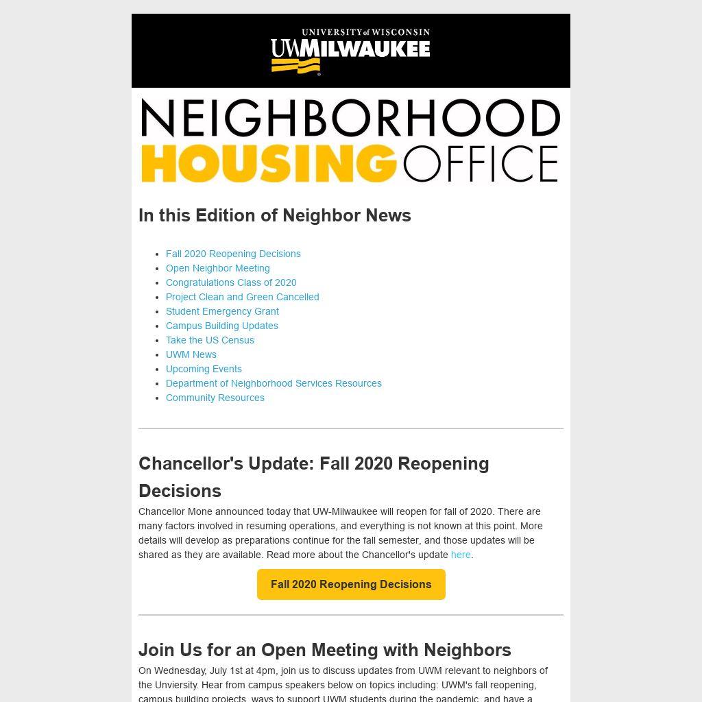 On Wednesday, July 1st at 4pm, join us to discuss updates from UWM relevant to neighbors of the Unviersity. Hear from campus speakers below on topics including: UWM's fall reopening, campus building projects, ways to support UWM students during the pandemic, and have a chance to ask questions at the end of the meeting. Join the meeting via phone by dialing +1 414-253-8850 and use Conference ID: 939 667 851#