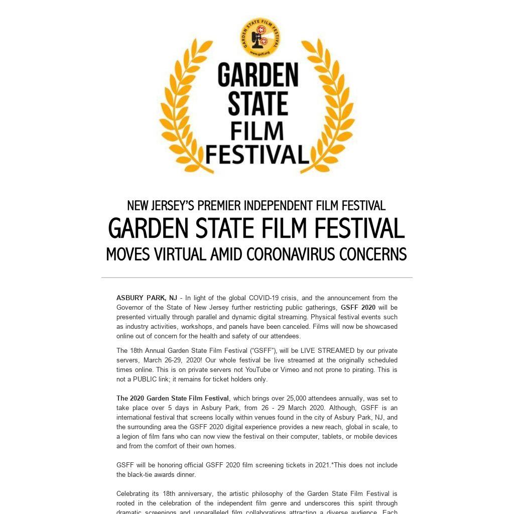 “Although impacted by the coronavirus pandemic which has forced the cancellation of the Garden State Film Festival’s annual event, we believe the opportunity to venture into a new digital frontier can serve as a blueprint for festivals worldwide and we look forward to bringing global film fans GSFF 2020 through online and virtual exposures. It promises to be a celebration of independent film that you can’t see anywhere else, all from the comfort of your home. Our top priority remains with the health and well-being of all those involved in this global event” - Lauren Concar Sheehy, Executive Director, Garden State Film Festival