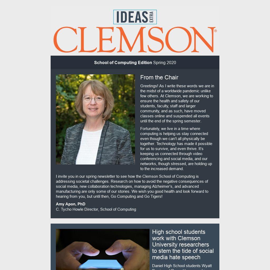 I invite you in our spring newsletter to see how the Clemson School of Computing is addressing societal challenges. Research on how to avoid the negative consequences of social media, new collaboration technologies, managing Alzheimer’s, and advanced manufacturing are only some of our stories. We wish you good health and look forward to hearing from you, but until then, Go Computing and Go Tigers!