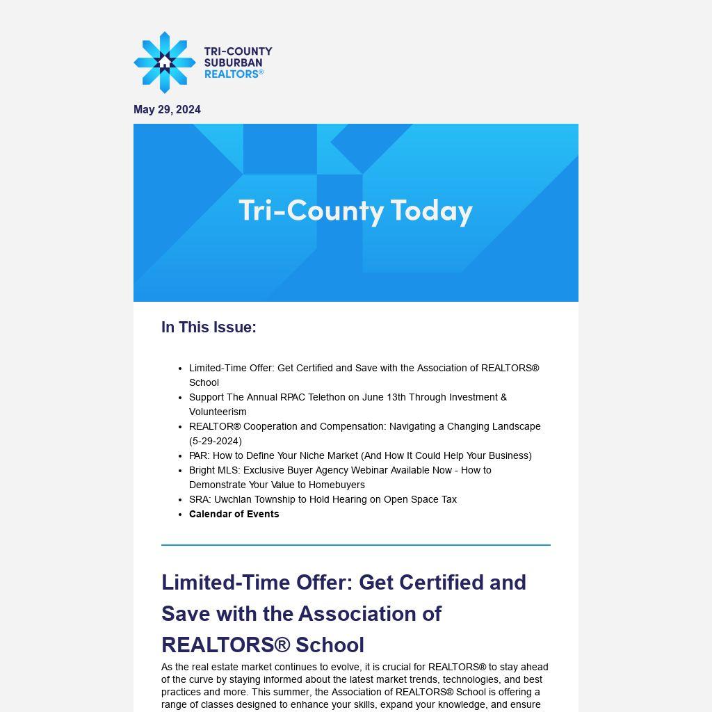 Following the proposed settlement of litigation claims brought on behalf of home sellers related to broker commissions, REALTORS® are left wondering how to move forward. Tri-County Suburban REALTORS® is committed to working closely with NAR and PAR to navigate next steps to ensure a seamless transition. Each week your Tri-County Today will bring information and resources to help members rise to the challenge of the changing industry.