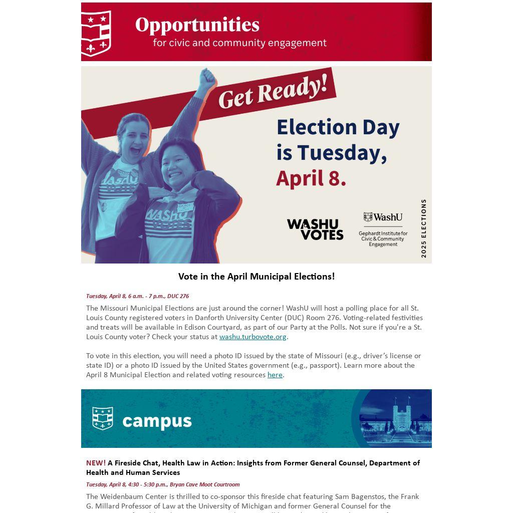 The Missouri Municipal Elections are just around the corner! WashU will host a polling place for all St. Louis County registered voters in Danforth University Center (DUC) Room 276. Voting-related festivities and treats will be available in Edison Courtyard, as part of our Party at the Polls. Not sure if you're a St. Louis County voter? Check your status at .Â