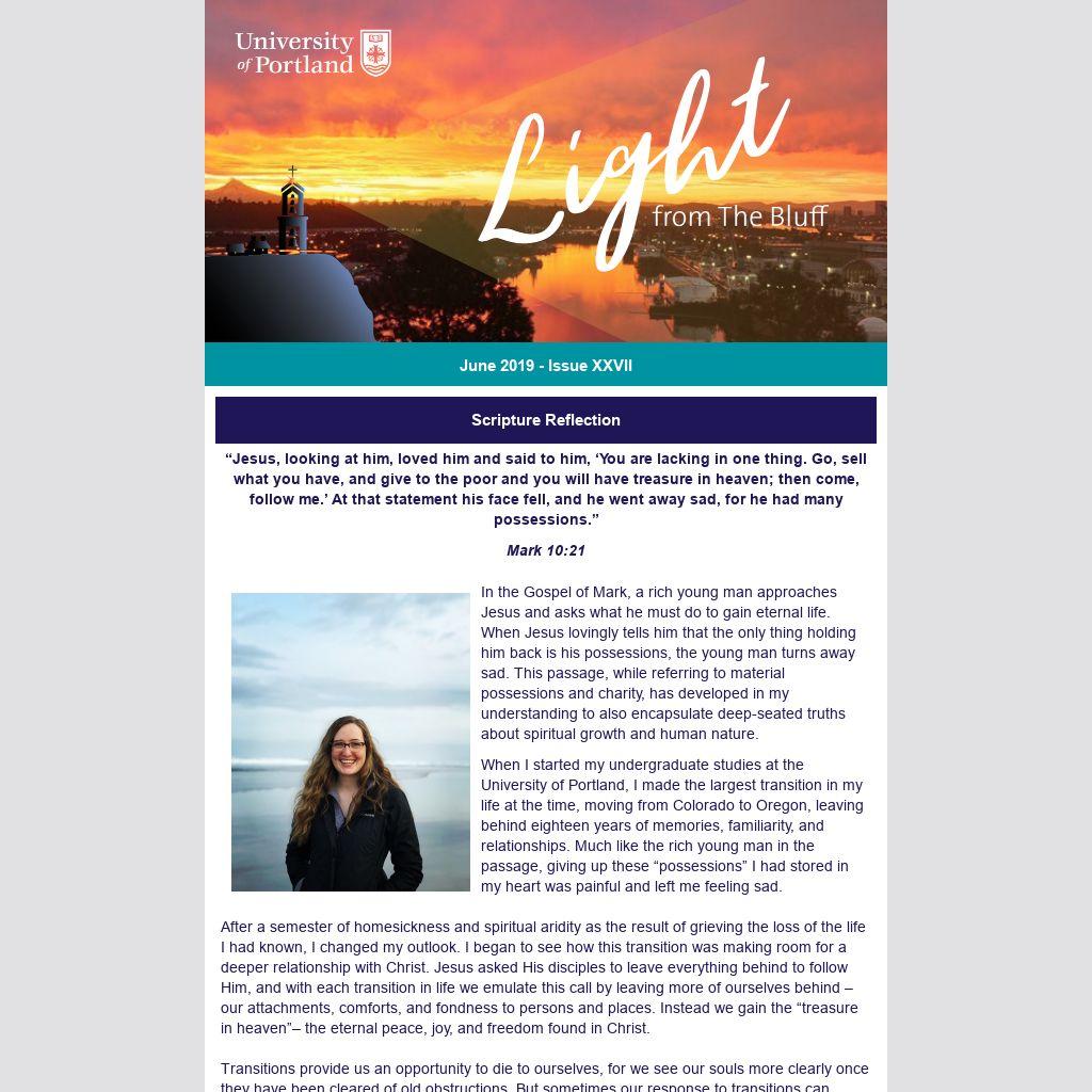 When I started my undergraduate studies at the University of Portland, I made the largest transition in my life at the time, moving from Colorado to Oregon, leaving behind eighteen years of memories, familiarity, and relationships. Much like the rich young man in the passage, giving up these “possessions” I had stored in my heart was painful and left me feeling sad.
