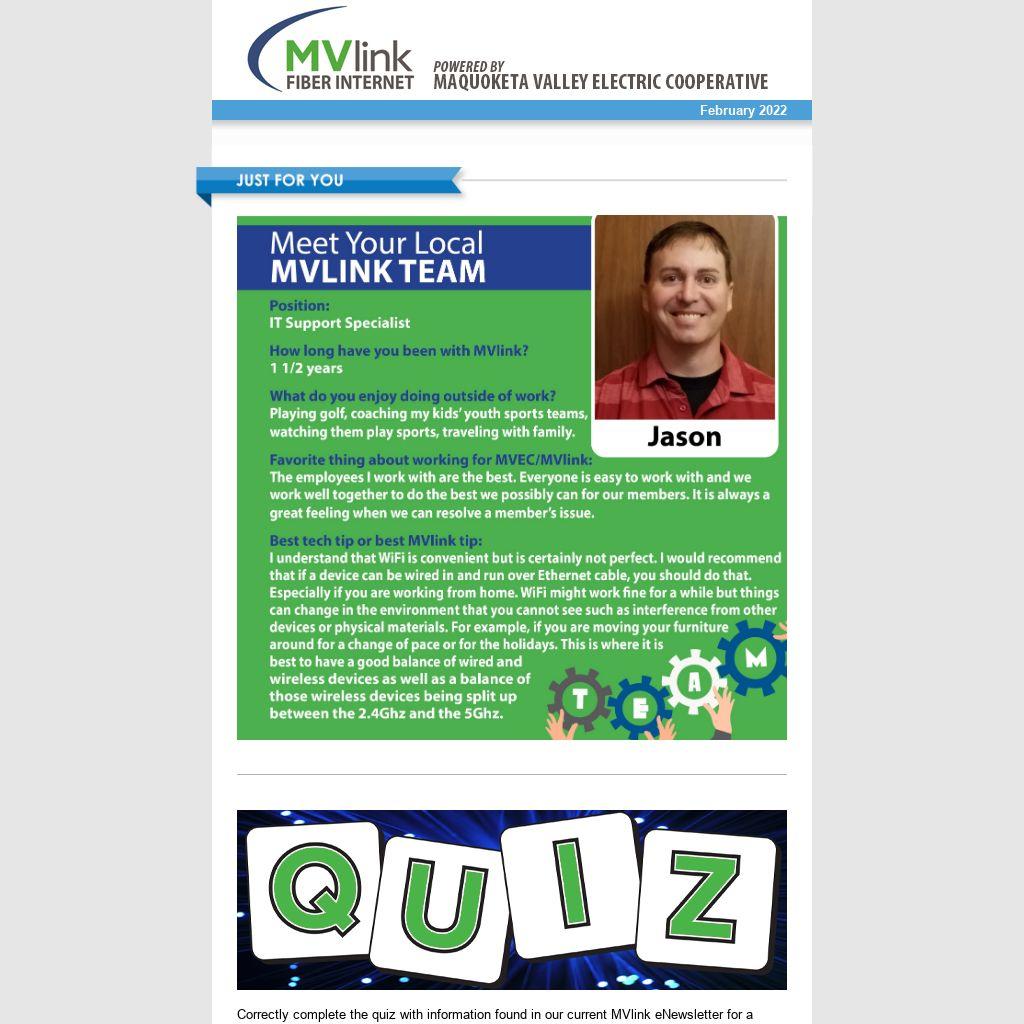 Correctly complete the quiz with information found in our current MVlink eNewsletter for a chance to win a $10 credit on your next internet bill. Click here to take the quiz! Congrats to last month's quiz winner — Vicki from Maquoketa. ![]()