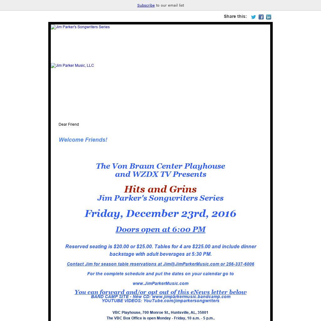 Contact Jim for season table reservations at Jim@JimParkerMusic.com or 256-337-6006