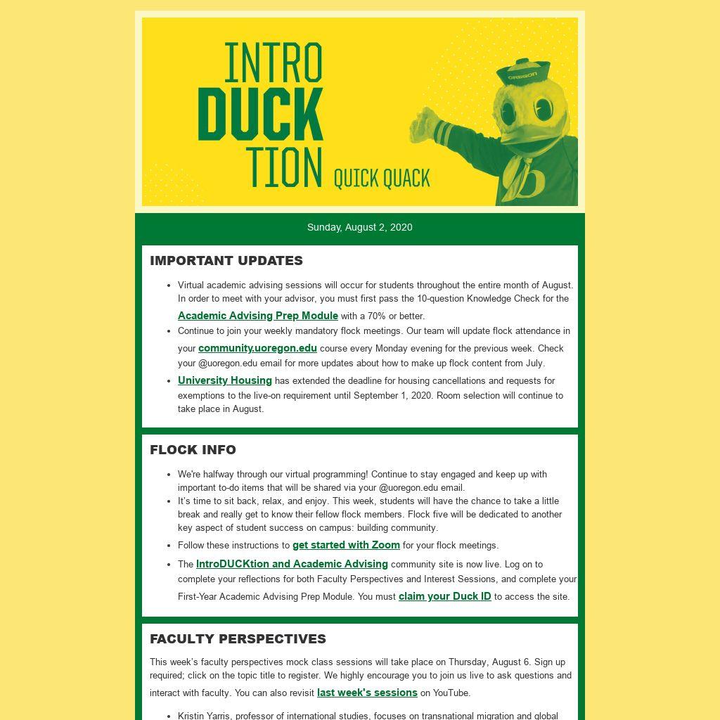 The IntroDUCKtion and Academic Advising community site is now live. Log on to complete your reflections for both Faculty Perspectives and Interest Sessions, and complete your First-Year Academic Advising Prep Module. You must claim your Duck ID to access the site.