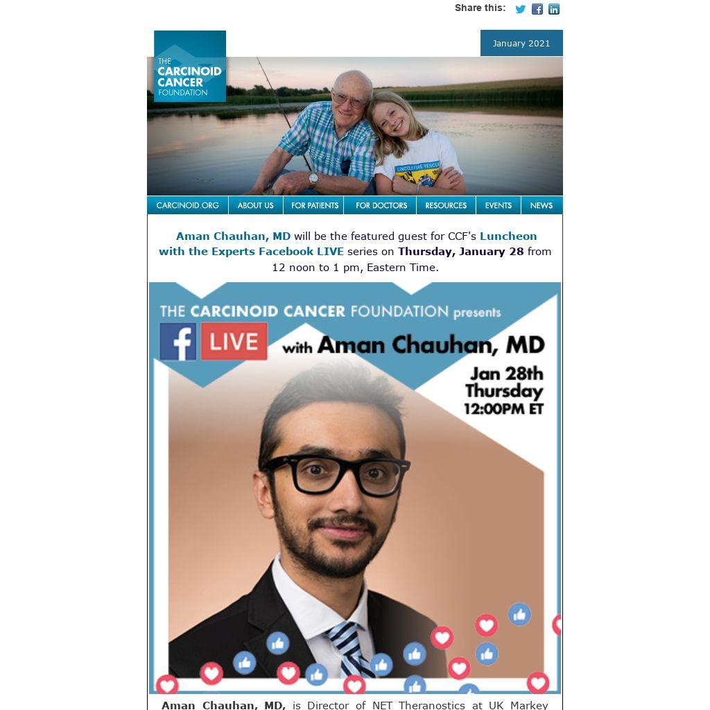 Aman Chauhan, MD will be the featured guest for CCF's Luncheon with the Experts Facebook LIVE series on Thursday, January 28 from 12 noon to 1 pm, Eastern Time.