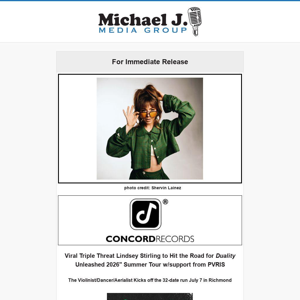 (January 26, 2026)--Global phenomenon Lindsey Stirling, the trailblazing multi-platinum electronic violinist, dancer, and aerialist, announces her new Duality Untamed Tour 2026 with special guest PVRIS, a 32-date North American run launching in Richmond, Virginia. The tour will bring Stirling’s genre-defying live show to major markets including Boston, Washington, DC, Phoenix, Seattle, Los Angeles, Kansas City, Nashville, and Chicago. Tickets for the tour will be available for presale beginning Tuesday, Jan. 27; with public onsale starting Friday, Jan. 30 at 10am local. Please visit www.lindseystirling.com/tour for more information on tickets and VIP sales.