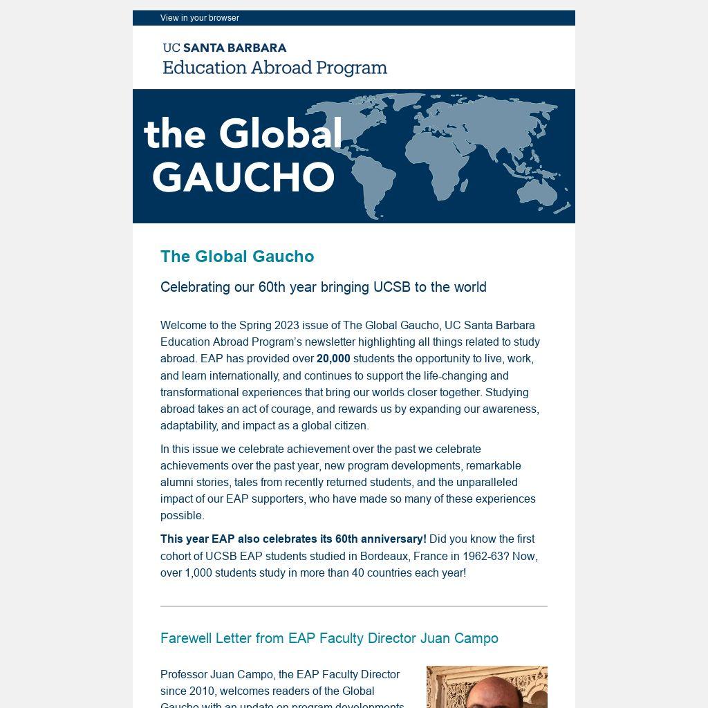 Welcome to the Spring 2023 issue of The Global Gaucho, UC Santa Barbara Education Abroad Program’s newsletter highlighting all things related to study abroad. EAP has provided over 20,000 students the opportunity to live, work, and learn internationally, and continues to support the life-changing and transformational experiences that bring our worlds closer together. Studying abroad takes an act of courage, and rewards us by expanding our awareness, adaptability, and impact as a global citizen.