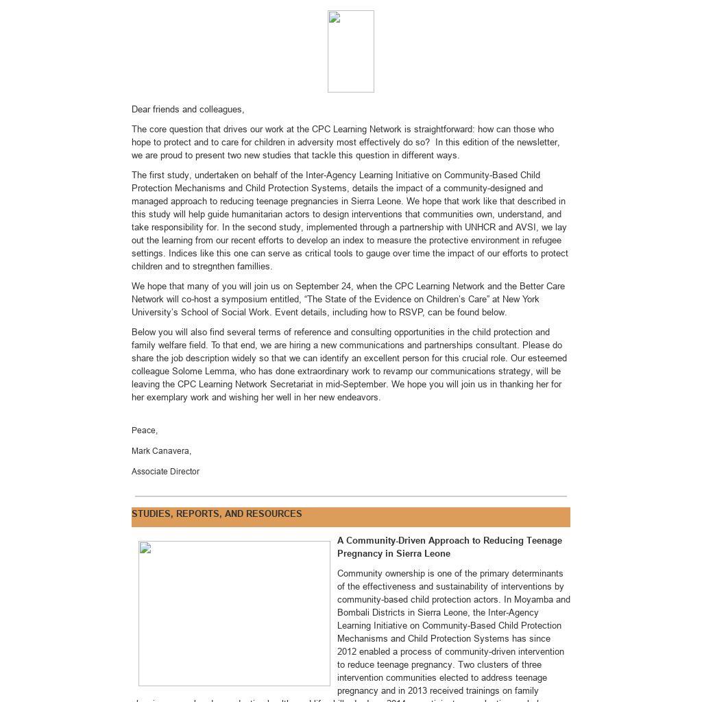 The core question that drives our work at the CPC Learning Network is straightforward: how can those who hope to protect and to care for children in adversity most effectively do so? In this edition of the newsletter, we are proud to present two new studies that tackle this question in different ways. The first study, undertaken on behalf of the Inter-Agency Learning Initiative on Community-Based Child Protection Mechanisms and Child Protection Systems, details the impact of a community-designed and managed approach to reducing teenage pregnancies in Sierra Leone. We hope that work like that described in this study will help guide humanitarian actors to design interventions that communities own, understand, and take responsibility for. In the second study, implemented through a partnership with UNHCR and AVSI, we lay out the learning from our recent efforts to develop an index to measure the protective environment in refugee settings. Indices like this one can serve as critical tools to gauge over time the impact of our efforts to protect children and to stregnthen famillies.