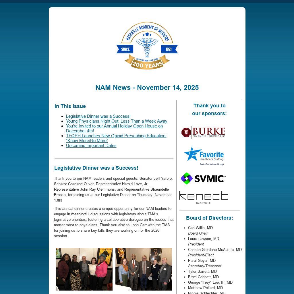 Date: Thursday, December 4, 2025 Time: 5:30 PM to 7:30 PM Location: NAM & MFN Offices - 28 White Bridge Pike, Suite 400, Nashville, TN 37205