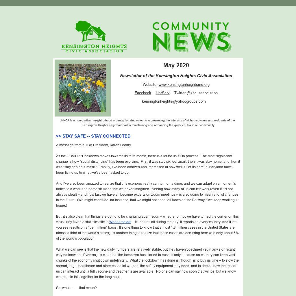 If you thought you remembered that we usually have a primary at the end of April, you’re right! It was set for April 28 but was postponed to June 2 due to the COVID-19 virus. Due to the ongoing effects of the virus, it will be run quite differently than in prior years (but, who knows, that may too be a preview of the future!). Anyone who has been an active voter in recent years will automatically be mailed a ballot with a return envelope with postage attached, so getting your ballot in will be about as simple as it can be. (Ballot will be going out soon, so you should receive yours shortly.) They must be postmarked by June 2, and there will be several sites at which ballots can be dropped off beginning May 21 through 8 pm on June 2, with the closest site to Kensington Heights located at the Silver Spring Civic Building.