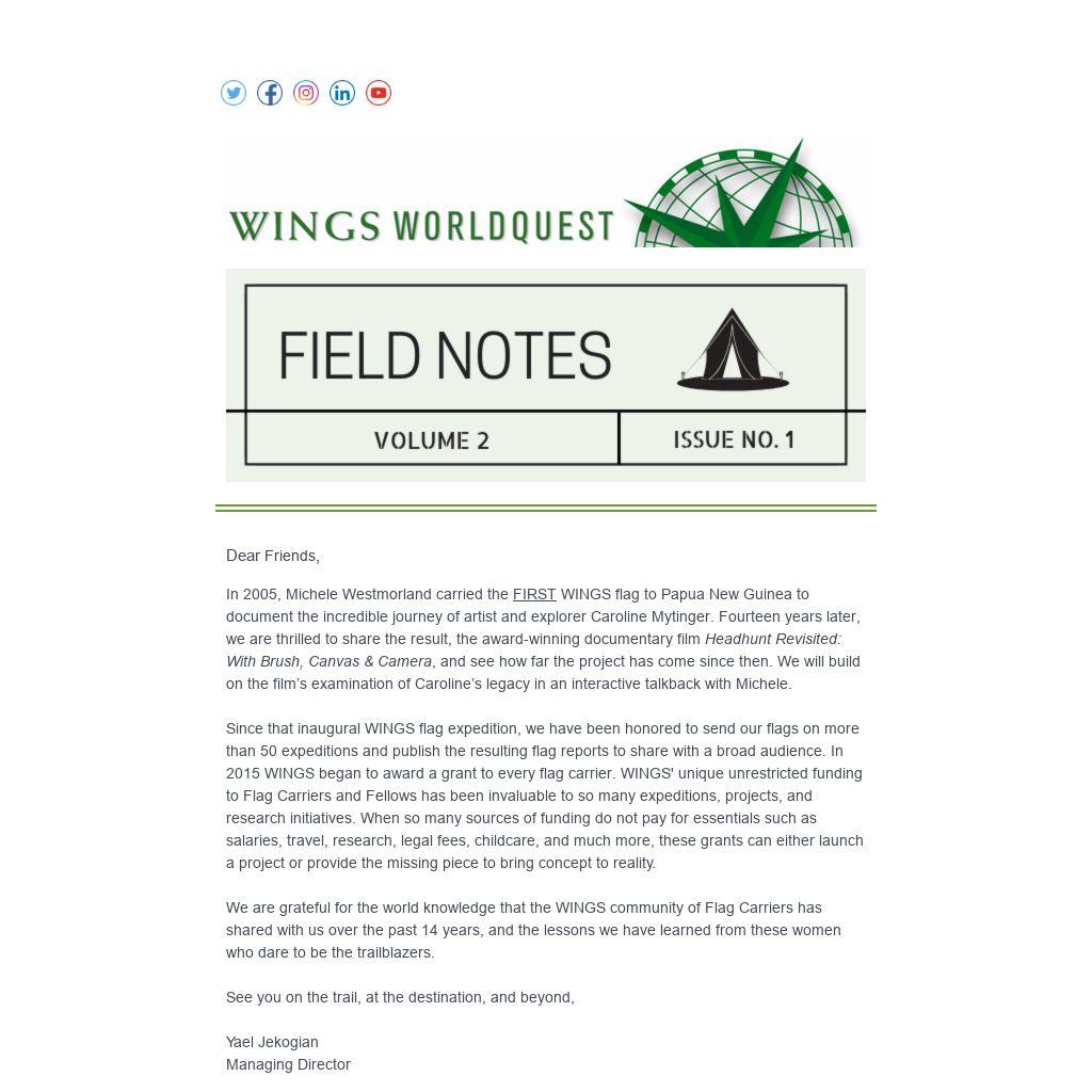 Since that inaugural WINGS flag expedition, we have been honored to send our flags on more than 50 expeditions and publish the resulting flag reports to share with a broad audience. In 2015 WINGS began to award a grant to every flag carrier. WINGS' unique unrestricted funding to Flag Carriers and Fellows has been invaluable to so many expeditions, projects, and research initiatives. When so many sources of funding do not pay for essentials such as salaries, travel, research, legal fees, childcare, and much more, these grants can either launch a project or provide the missing piece to bring concept to reality.
