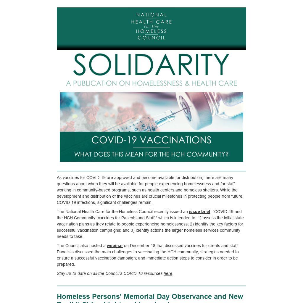 The National Health Care for the Homeless Council recently issued an issue brief, "COVID-19 and the HCH Community: Vaccines for Patients and Staff," which is intended to: 1) assess the initial state vaccination plans as they relate to people experiencing homelessness; 2) identify the key factors for successful vaccination campaigns; and 3) identify actions the larger homeless services community needs to take.