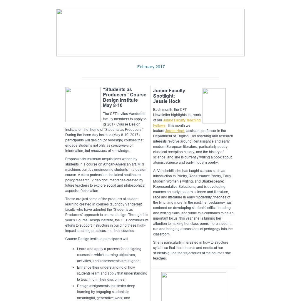 May 8-10 The CFT invites Vanderbilt faculty members to apply to its 2017 Course Design Institute on the theme of “Students as Producers.” During the three-day institute (May 8-10, 2017) participants will design (or redesign) courses that engage students not only as consumers of information, but producers of knowledge. Proposals for museum acquisitions written by students in a course on African-American art. MRI machines built by engineering students in a design course. A class podcast on the latest healthcare policy research. Video documentaries created by future teachers to explore social and philosophical aspects of education. These are just some of the products of student learning created in courses taught by Vanderbilt faculty who have adopted the “Students as Producers” approach to course design. Through this year’s Course Design Institute, the CFT continues its efforts to support instructors in building these high-impact teaching practices into their courses. Course Design Institute participants will… - Learn and apply a process for designing courses in which learning objectives, activities, and assessments are aligned;
