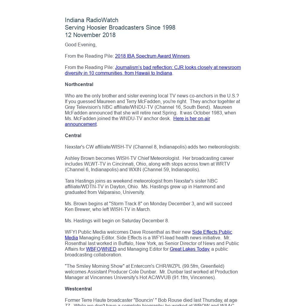 Indiana RadioWatch subscriptions are free. To subscribe, send an e-mail to irw@well.com and we'll add you. After publication, we archive Indiana RadioWatch on the Indiana Radio Archive at http://www.indianaradio.net. Please e-mail us your news stories and employment opportunities.