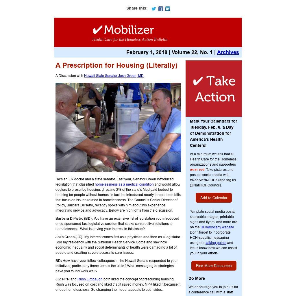 | Mark Your Calendars for Tuesday, Feb. 6, a Day of Demonstration for America's Health Centers! At a minimum we ask that all Health Care for the Homeless organizations and supporters wear red. Take pictures and post on social media with #RedAlert4CHCs (and tag us @NatlHCHCouncil).