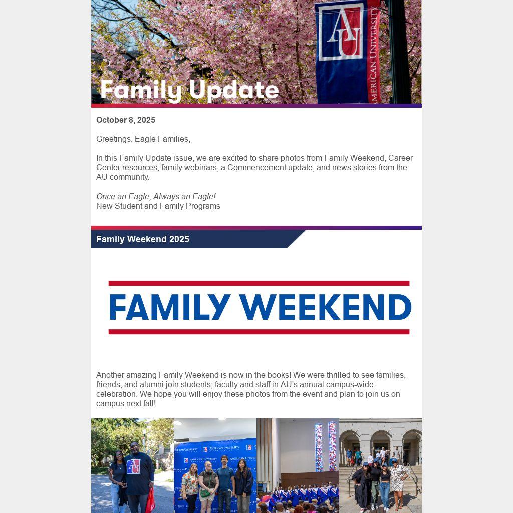 In this Family Update issue, we are excited to share photos from Family Weekend, Career Center resources, family webinars, a Commencement update, and news stories from the AU community.Â