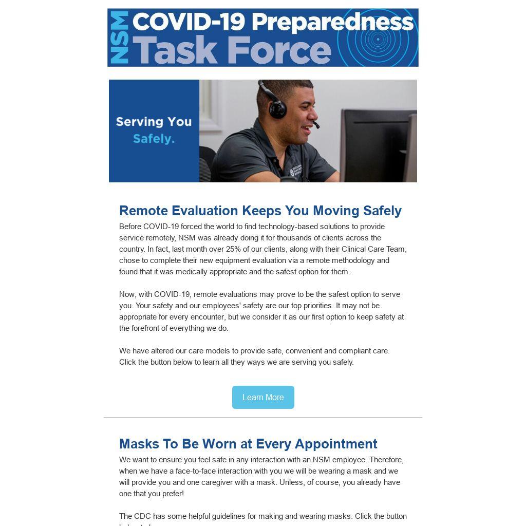 Before COVID-19 forced the world to find technology-based solutions to provide service remotely, NSM was already doing it for thousands of clients across the country. In fact, last month over 25% of our clients, along with their Clinical Care Team, chose to complete their new equipment evaluation via a remote methodology and found that it was medically appropriate and the safest option for them.