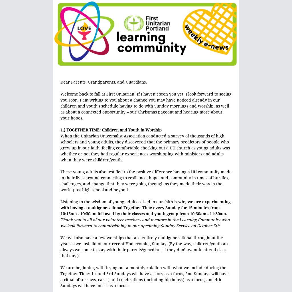 Listening to the wisdom of young adults raised in our faith is why we are experimenting with having a multigenerational Together Time every Sunday for 15 minutes from 10:15am - 10:30am followed by their classes and youth group from 10:30am - 11:30am. Thank you to all of our volunteer teachers and mentors in the Learning Community who we look forward to commissioning in our upcoming Sunday Service on October 5th.