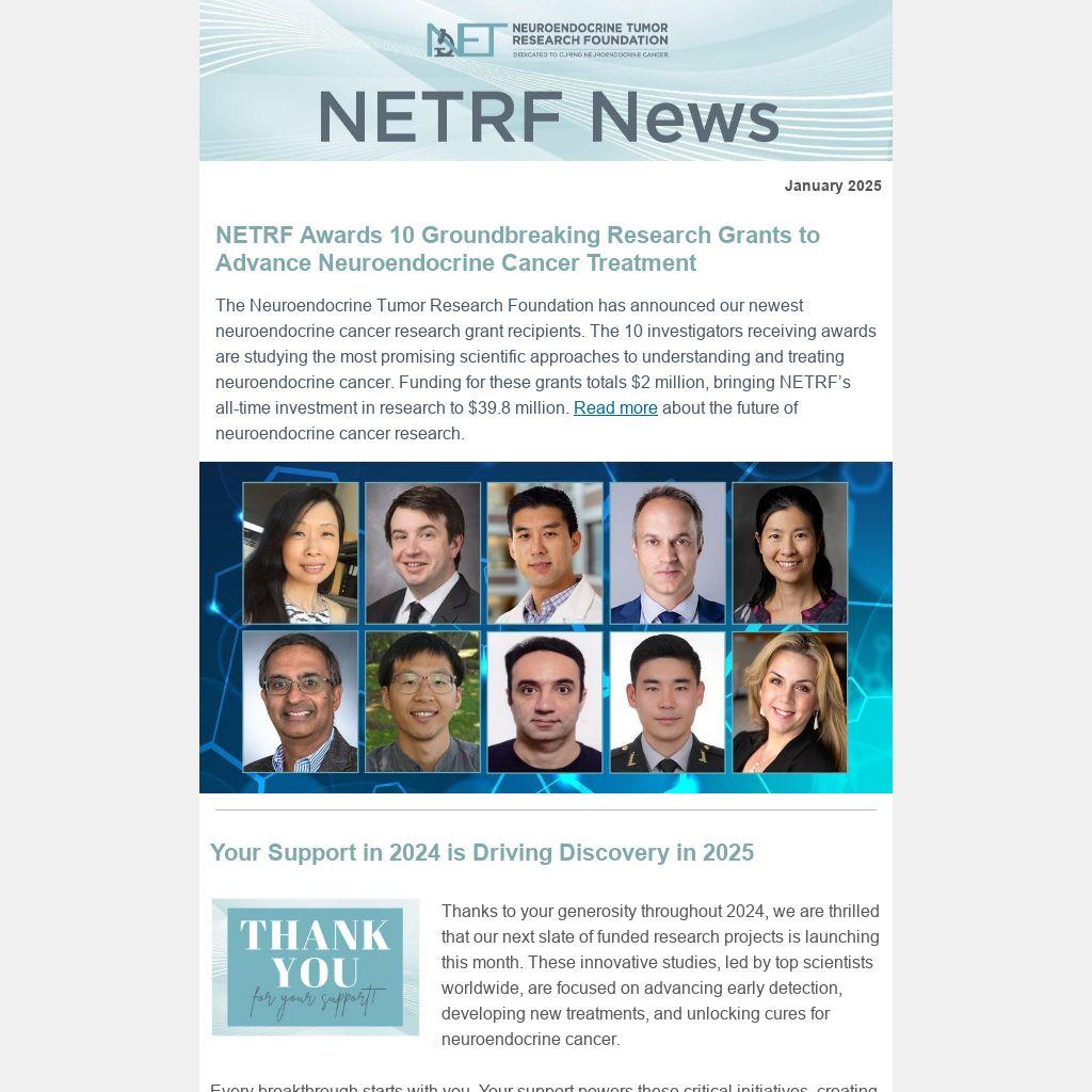 Your generosity in 2024 made groundbreaking research possible—and we’re just getting started. As we launch new, innovative projects this year, your ongoing support is vital to driving discoveries that lead to better treatments and cures for neuroendocrine cancer.